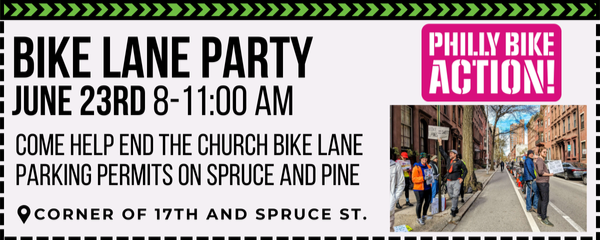 Summer is here and we are here to party for all of June! Come make some new friends and advocate for safer bike lane as we work to end the congregational bike lane parking permits. Stay tuned to our Instagram account (@phlbikeaction) for our weekly theme.